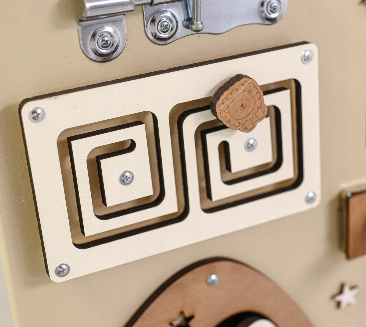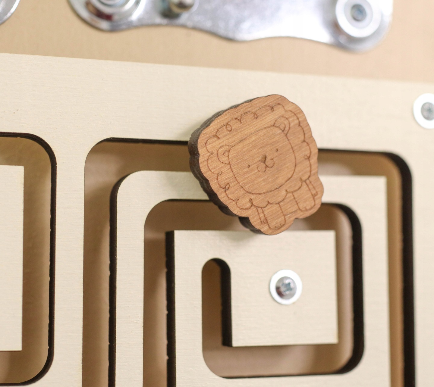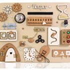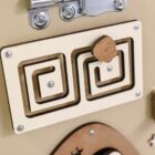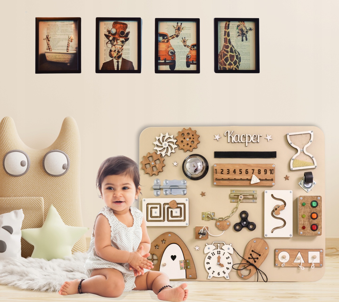 Tablica zawiera ponad 25 interaktywnych elementów, m.in. zamek, sznurowadła, diody LED i labirynty. Uczy logicznego myślenia, motoryki i koncentracji.