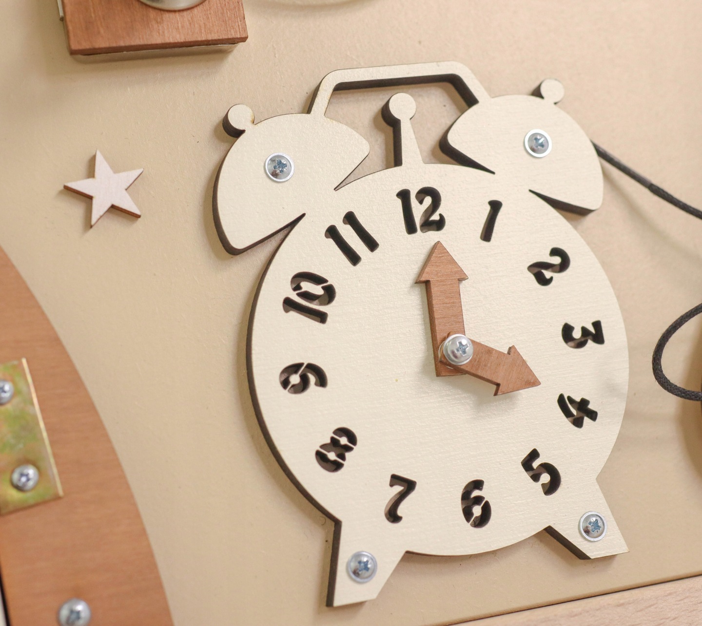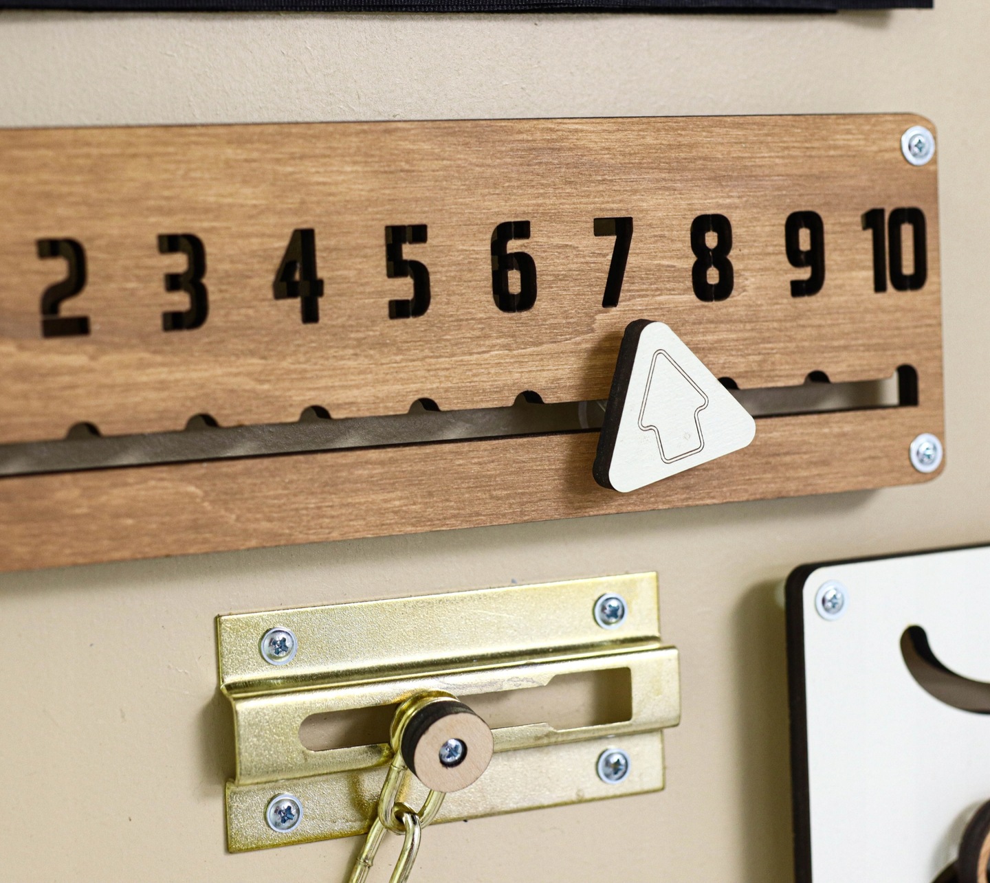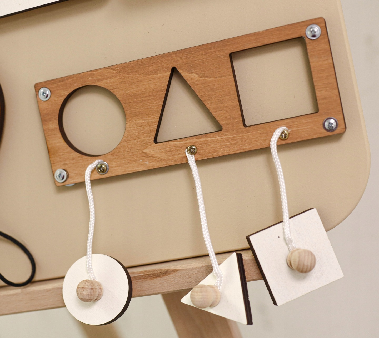 Tablica zawiera ponad 25 interaktywnych elementów, m.in. zamek, sznurowadła, diody LED i labirynty. Uczy logicznego myślenia, motoryki i koncentracji.